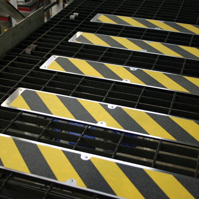 Taśma antypoślizgowa na podłożu aluminiowym. Znacznie redukuje ryzyko poślizgnięcia na schodach lub metalowych platformach kratowych. Łatwy montaż – możliwość przymocowania za pomocą śrub, wkrętów, zacisków lub gwoździ. Dostępne pojedynczo lub w opakowaniach po 5 sztuk.